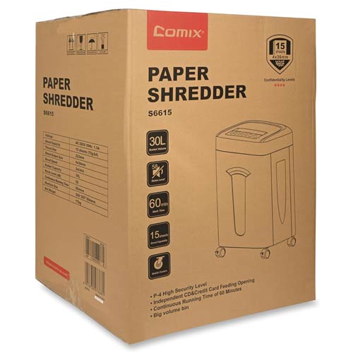 In summary, the COMIX S6615 delivers secure, reliable, and convenient shredding for offices that need a practical solution for everyday document destruction. Its balance of capacity, safety, and performance makes it a dependable choice for maintaining confidentiality and streamlining office workflows.