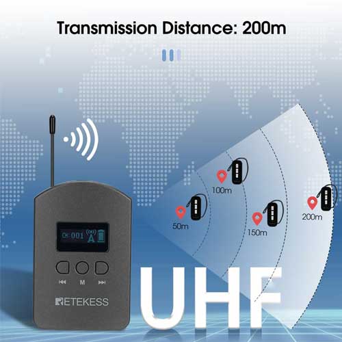 ✔️ UHF Wireless Range: Up to 200 m open-field coverage for guided groups