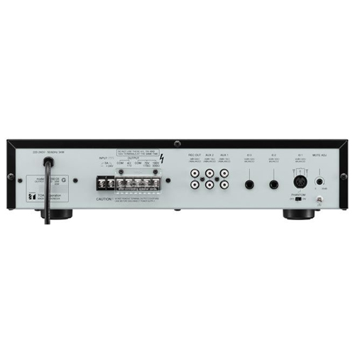 | Output | Speaker out: Balanced (floating), M3.5 screw terminal, distance between barriers: 8.3 mm (0.33") High impedance: 330 Ω (100 V), 170 Ω (70 V) Low impedance: 4 Ω (11 V) Rec out: 0 dB*, 600 Ω, unbalanced, RCA pin jack |